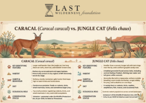 Caracals and Jungle Cats are often confused due to their similar size and appearance. However, they are two distinct wild cat species with different physical features, habitats, and behaviours. Correct identification is important for improving awareness and reducing misinformation about wildlife found in human-dominated landscapes.