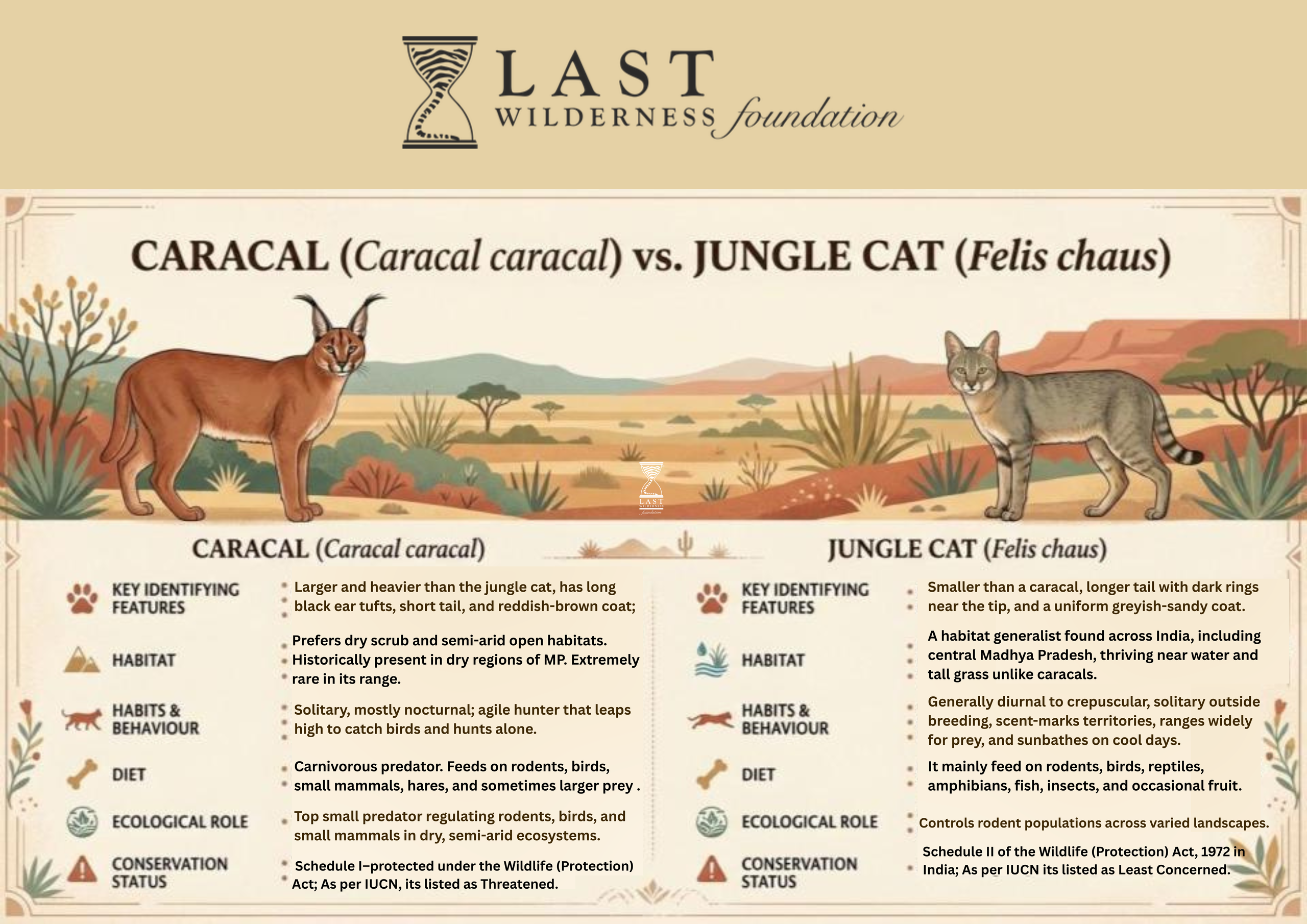 This poster highlights the key differences between a Caracal and a Jungle Cat, helping viewers distinguish between the two through easily identifiable characteristics. It is designed as an awareness and learning tool for both urban and rural audiences.