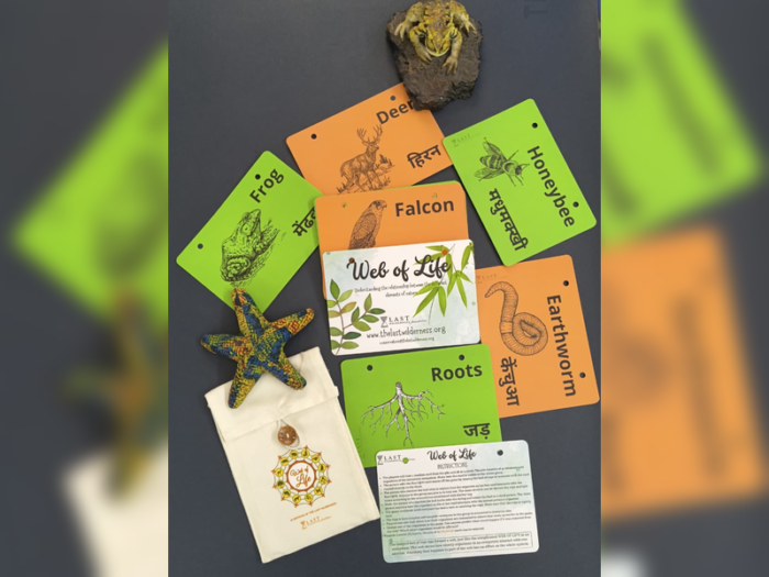 A complete Web of Life game kit, including role cards and connection material, packed in a durable, reusable pouch for easy storage and repeated use.