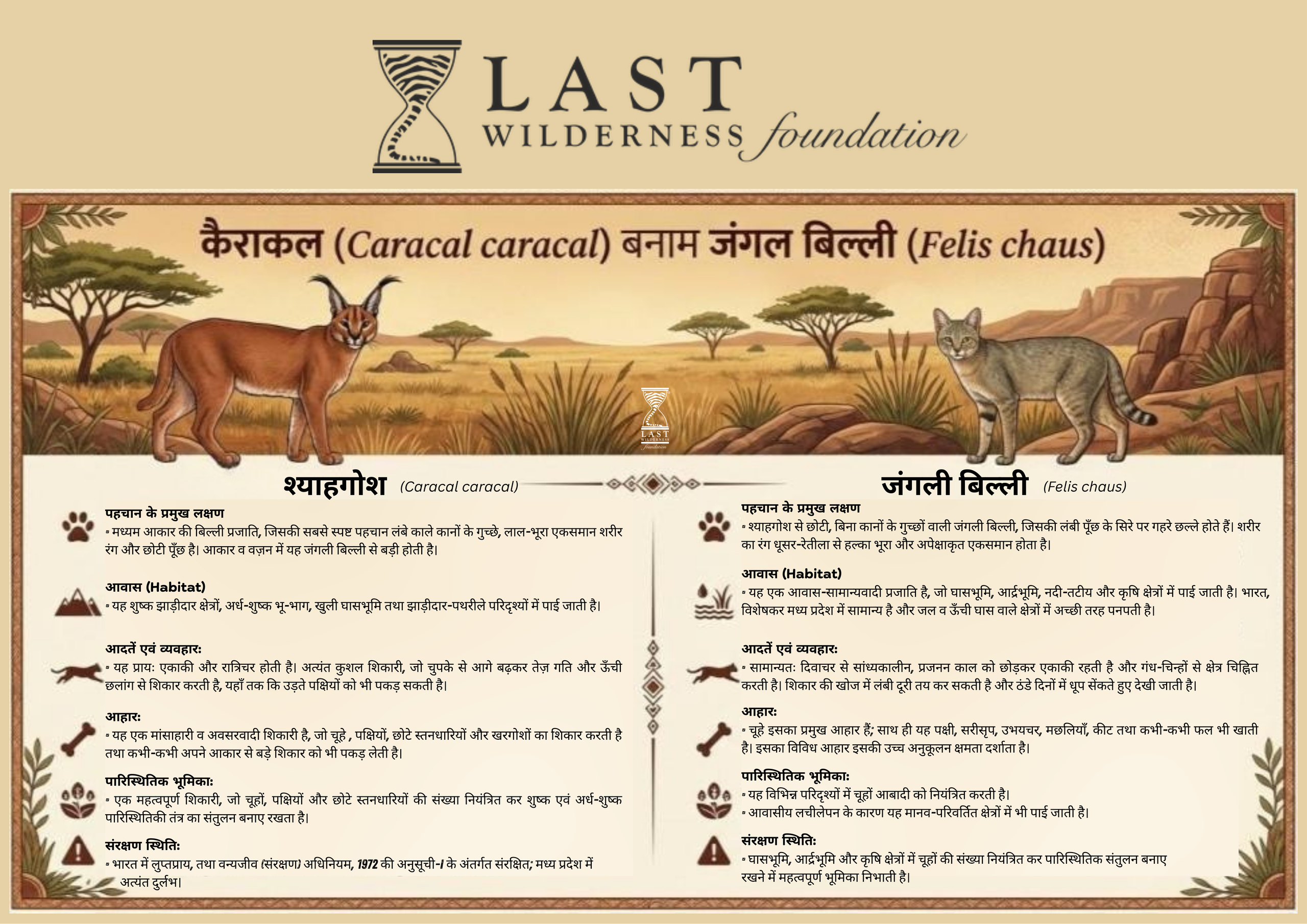 यह पोस्टर श्याहगोश और जंगली बिल्ली के बीच मुख्य अंतर को सरल और आसानी से पहचाने जा सकने वाले लक्षणों के माध्यम से दर्शाता है। इसे शहरी और ग्रामीण दोनों क्षेत्रों के लिए एक जागरूकता एवं सीखने के साधन के रूप में तैयार किया गया है।
