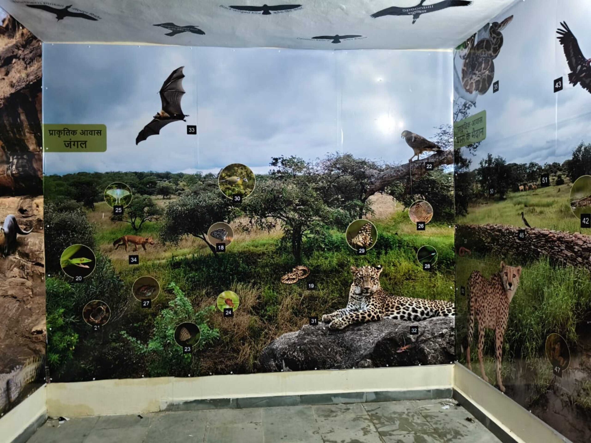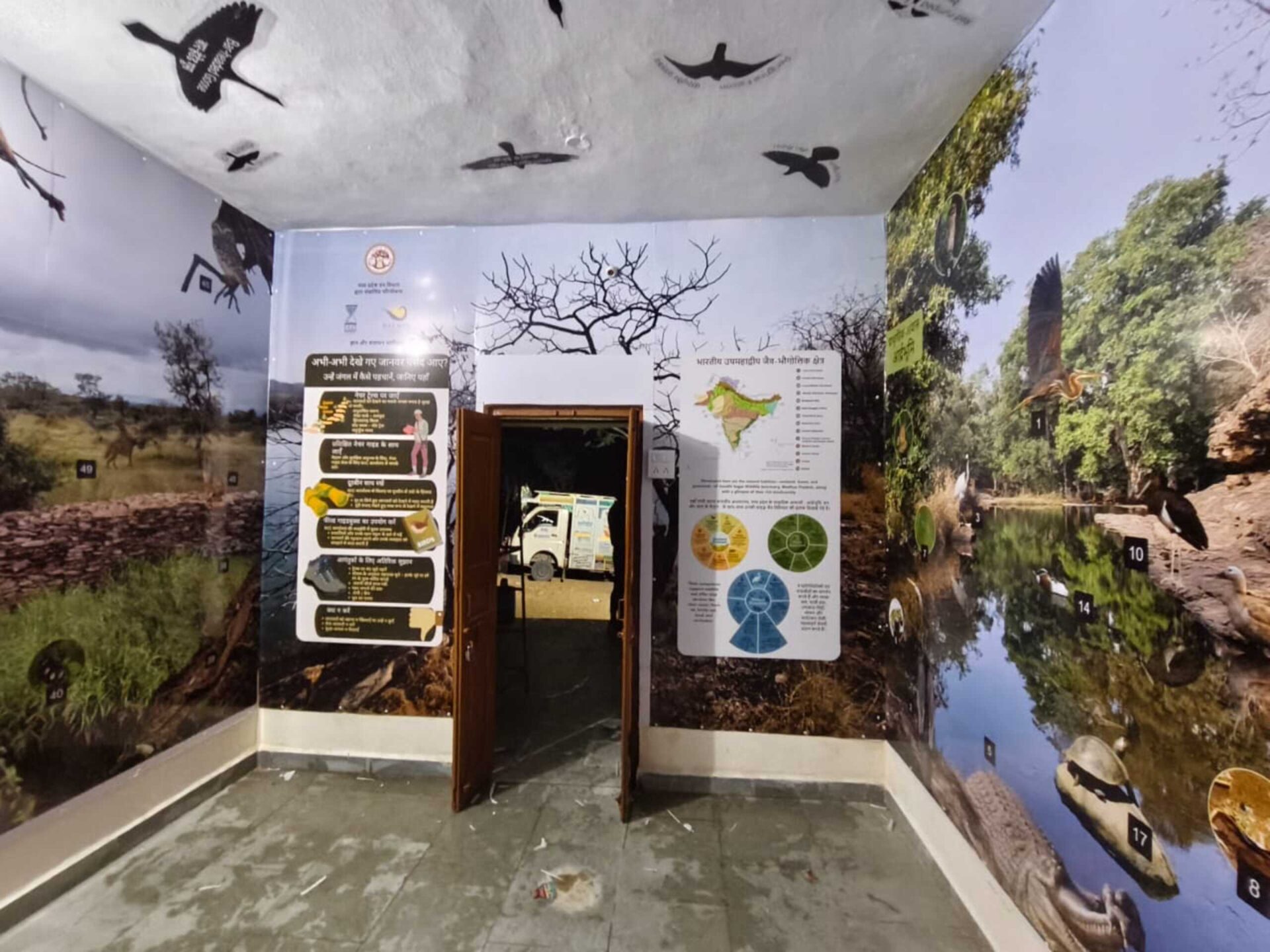 To make the experience more immersive, the space was transformed with creative visual elements. Ceiling stickers featuring bird silhouettes and floor decals designed as animal pugmarks encouraged visitors to observe, explore, and “track” wildlife in an interactive setting.